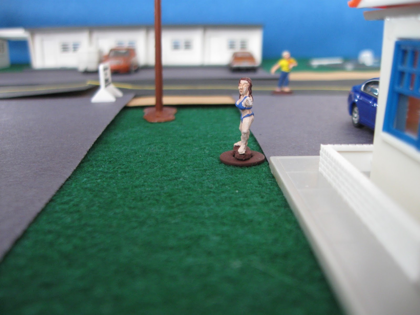 Just to be safe, Bob reloads and then begins a careful investigation of the buildings. He finds no one in the restaurant, but runs into a zed in the service station, which he dispatches with a fortunate OD from the shotgun. Searching the motel office and rooms, he finds a Male, Rep 3, Wuss, no weapons named Ted in one of the motel rooms. They pass the same number of dice on Talk the Talk and decide to part amiably as the Wuss doesn't want to join Bob.